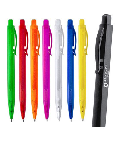Original bolígrafo con cuerpo rectangular de acabado translúcido monocolor. Con mecanismo pulsador, original clip y disponible en extensa gama de colores. Tinta azul.