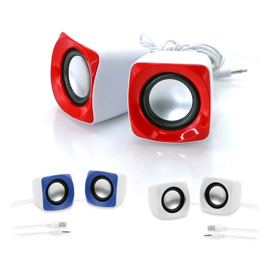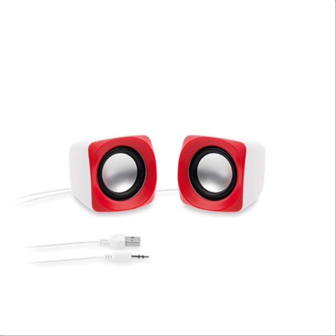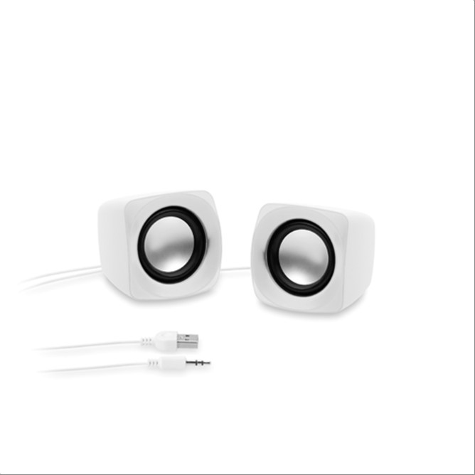 Pareja de altavoces de escritorio en diseño minimalista bicolor. Ofrecen 3W de potencia y reproducción mediante conexión jack de 3,5mm. Alimentación por cable USB -incluido- y presentados en atractiva caja de diseño.